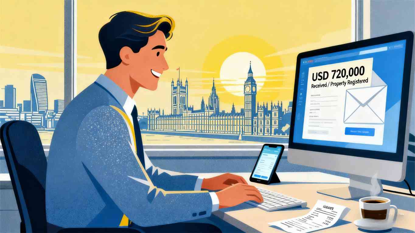 金先生在伦敦投资了一套高端商住公寓。房产顺利交付后,律师事务所发来邮件通知:需在十天内支付72万美金(约合人民币约512万元),用于结清房产税、律师费以及过户杂费。邮件特别注明——若未在期限内完成支付,房产登记将自动延后,甚至可能影响产权生效。
